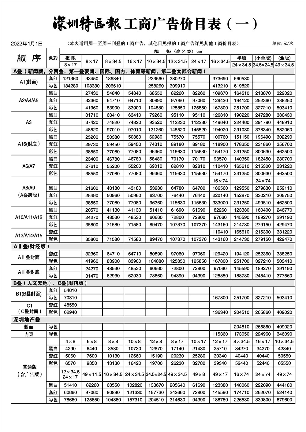 深圳特區(qū)報(bào)工商廣告價目表