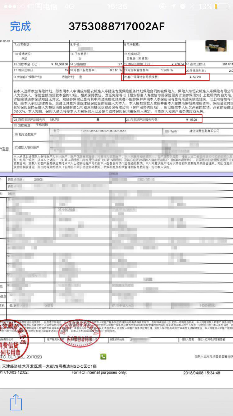 “整個貸款過程我都沒有和他們簽署任何紙質合同,也沒見過合同,后來我投訴給他們,他們才提醒我捷信AAP里有合同,那份合同的資料、照片、簽名都是復制我購買手機時第一次簽署的合同。要是早給我看合同,我絕對不會貸款的?!焙蜗壬嬖V記者。