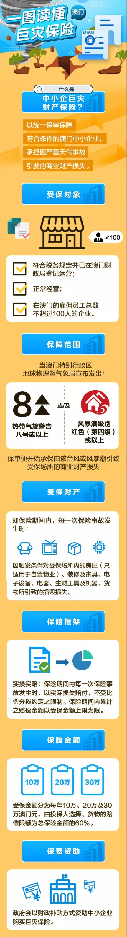 7月31日,今年首個臺風“韋帕”來襲,香港、澳門氣象部門相繼懸掛8號風球,并發(fā)布黃色風暴潮警告。在持續(xù)強降雨和大風之際,澳門金融管理局和經濟局舉行聯合新聞發(fā)布會,宣布推出“中小企巨災財產保險”,為中小企業(yè)在8號風球/紅色風暴潮或以上警告期間,所遭受的商業(yè)財產損失提供保險保障。中國太平旗下太平澳門簽出中小企巨災財產保險第一單,為當地中小企業(yè)帶來定心丸。