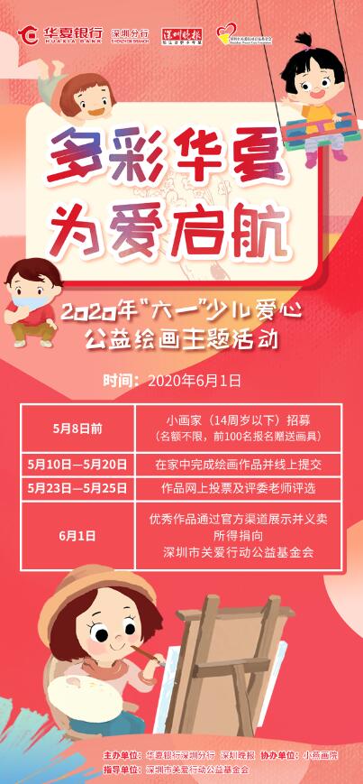 據(jù)了解,該活動是由華夏銀行深圳分行攜手深圳晚報、小燕畫院開展的“多彩華夏為愛啟航”少兒愛心公益繪畫?;顒酉蛏钲谑忻裾心夹‘嫾?,邀請他們用手中畫筆描繪精彩世界。同時,將繪畫賦予公益與愛心,評選出部分優(yōu)秀作品進行線上義賣,以點亮地貧兒童的生命之光。