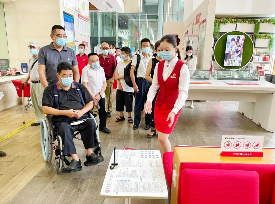 交流座談會(huì)結(jié)束后,全體黨員干部來(lái)到中信銀行深圳城市廣場(chǎng)旗艦支行現(xiàn)場(chǎng)體驗(yàn)網(wǎng)點(diǎn)無(wú)障礙設(shè)施和服務(wù),支部黨員與障礙人士現(xiàn)場(chǎng)溝通交流,為改進(jìn)無(wú)障礙服務(wù)提出有益建議。
