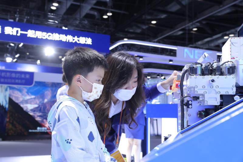 在服貿(mào)會(huì)現(xiàn)場,一個(gè)小男孩躲在奶奶身后好奇的地望著中國太保展臺(tái)上的氫能源發(fā)動(dòng)機(jī)。