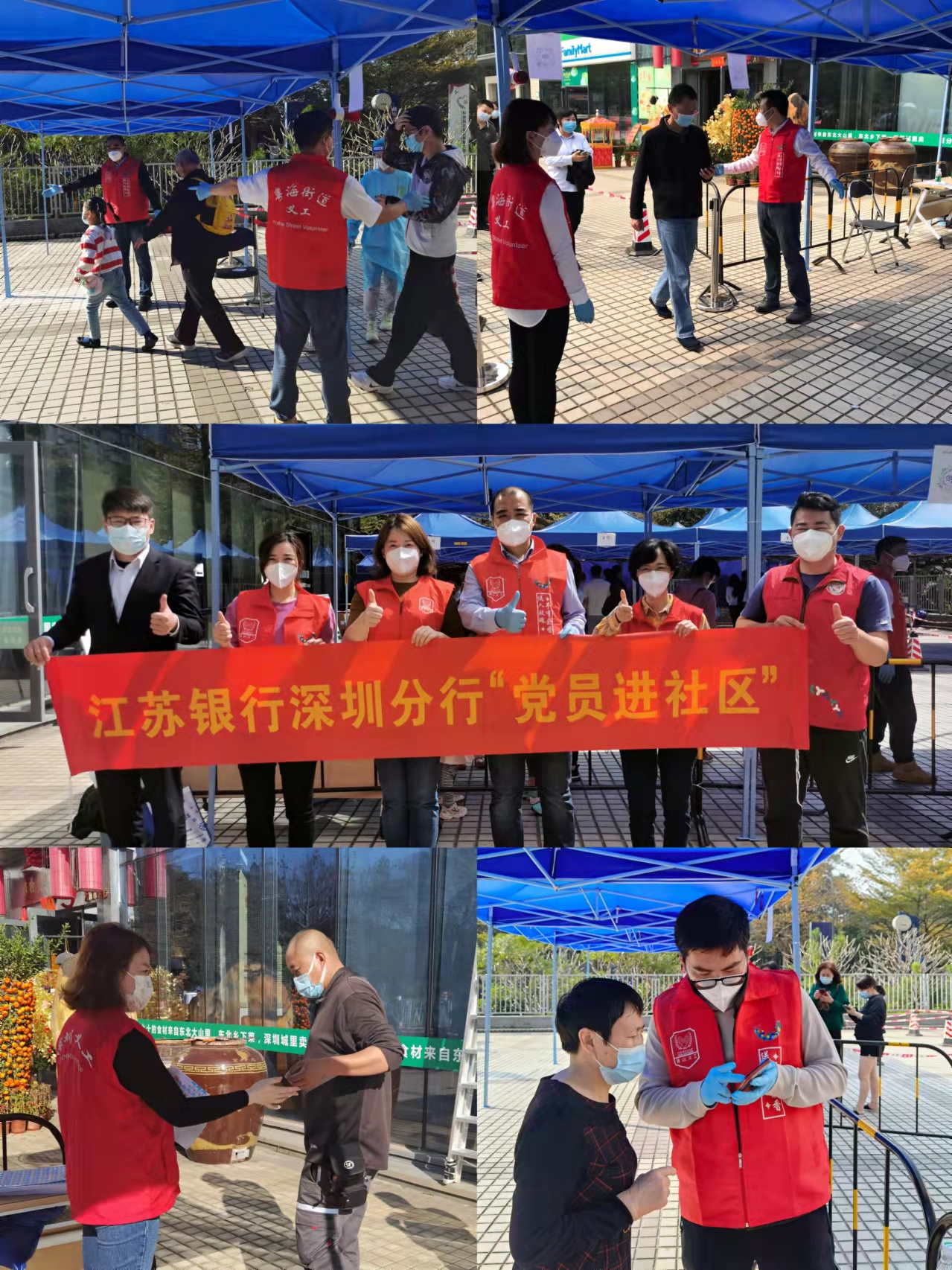 在該行黨委統(tǒng)一部署及有效組織下,江蘇銀行深圳分行營(yíng)業(yè)部、福田支行、南山支行、前海支行等基層黨組織快速響應(yīng),立即組建起由黨支部書(shū)記、支行行長(zhǎng)帶頭的志愿先鋒隊(duì)。2月中旬起,江蘇銀行深圳分行志愿先鋒隊(duì)忙碌在福田海濱社區(qū)、南山蔚藍(lán)海岸社區(qū)、高新區(qū)社區(qū)等多個(gè)核酸檢測(cè)點(diǎn),在核酸采樣現(xiàn)場(chǎng)提醒民眾查驗(yàn)健康碼、協(xié)助秩序維護(hù)、做好防疫宣傳、協(xié)助搬運(yùn)物資、進(jìn)行核酸引導(dǎo)、解答防疫問(wèn)題。與社區(qū)醫(yī)護(hù)人員一起奮斗在抗疫第一線,用行動(dòng)踐行初心,用汗水書(shū)寫(xiě)擔(dān)當(dāng),用責(zé)任與堅(jiān)守共筑抗疫“紅色防線”。