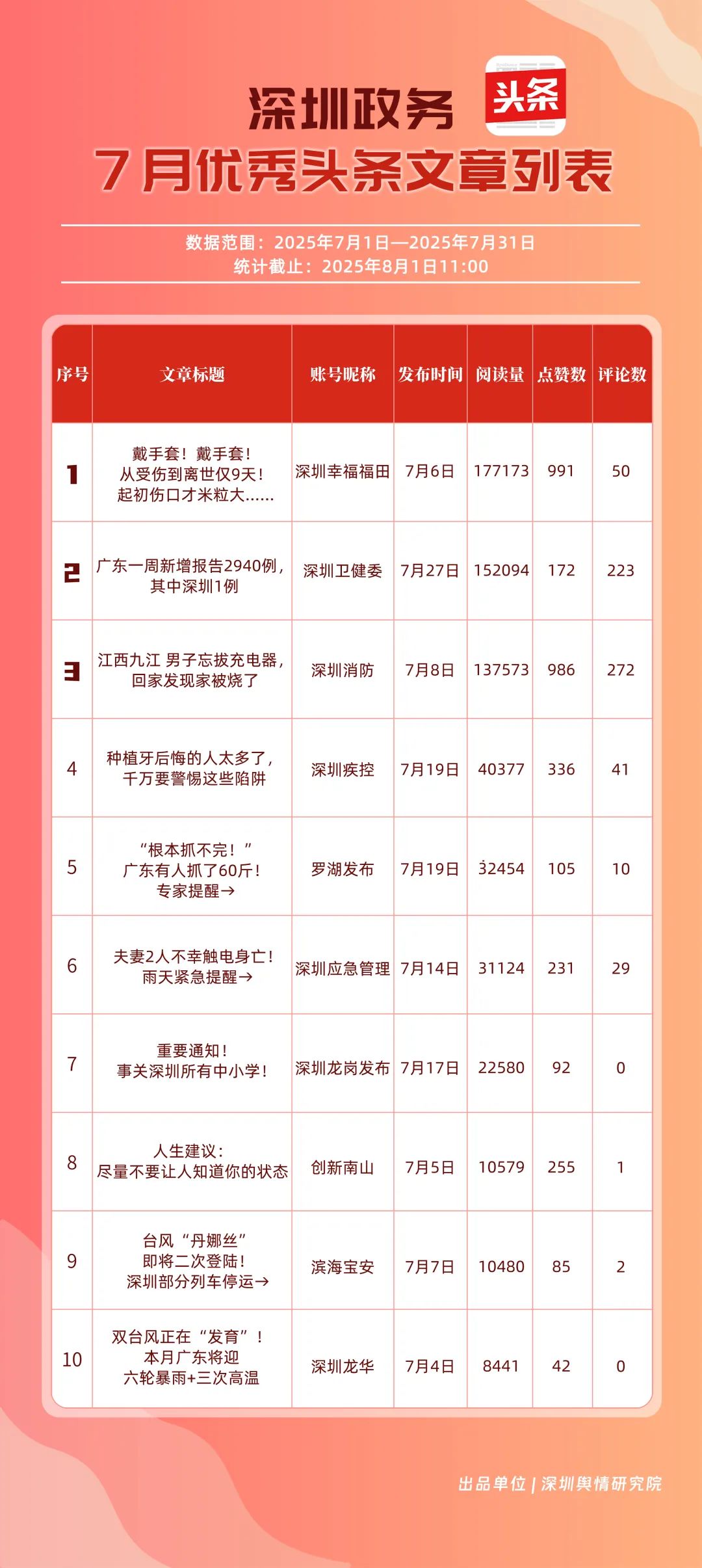 7月,“深圳幸福福田”“深圳消防”“深圳衛(wèi)健委”“深圳疾控”“創(chuàng)新南山”“羅湖發(fā)布”“深圳應(yīng)急管理”“濱海寶安”“深圳龍崗發(fā)布”“坪山發(fā)布”共10個(gè)政務(wù)頭條號(hào)入選“優(yōu)秀政務(wù)頭條號(hào)”榜單?!吧钲谛腋8L铩薄吧钲谙馈睉{借優(yōu)質(zhì)內(nèi)容持續(xù)吸引用戶關(guān)注,穩(wěn)居前二;“深圳衛(wèi)健委”表現(xiàn)亮眼,評(píng)分達(dá)92.68分,排名較6月有所上升;“深圳疾控”同樣進(jìn)步明顯,在疾病預(yù)防控制信息傳播上發(fā)揮了重要作用?!皠?chuàng)新南山”“羅湖發(fā)布”“深圳應(yīng)急管理”等上榜賬號(hào),也各展所長,始終將優(yōu)質(zhì)內(nèi)容作為核心抓手,成為政務(wù)新媒體領(lǐng)域內(nèi)容創(chuàng)作與傳播的典范。