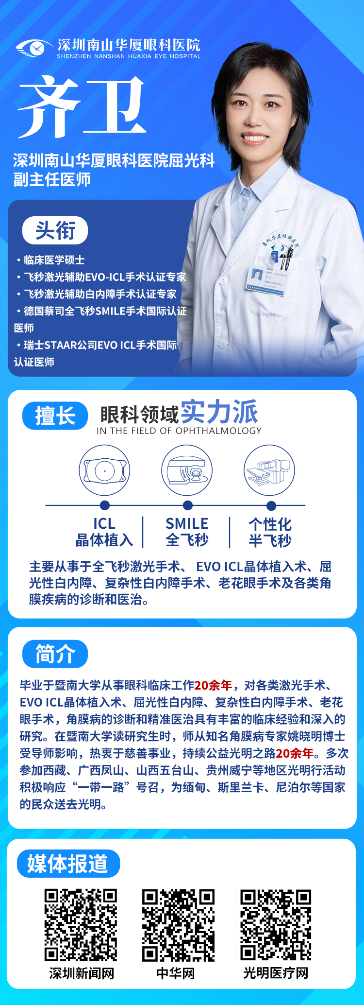 畢業(yè)于暨南大學(xué)的齊衛(wèi)主任,師從知名角膜病專家姚曉明博士,從求學(xué)時起就對眼科事業(yè)的熱愛。臨床工作中,而且她在激光手術(shù)、EVO ICL 晶體植入術(shù)、屈光性白內(nèi)障手術(shù)等領(lǐng)域積累了深厚造詣。