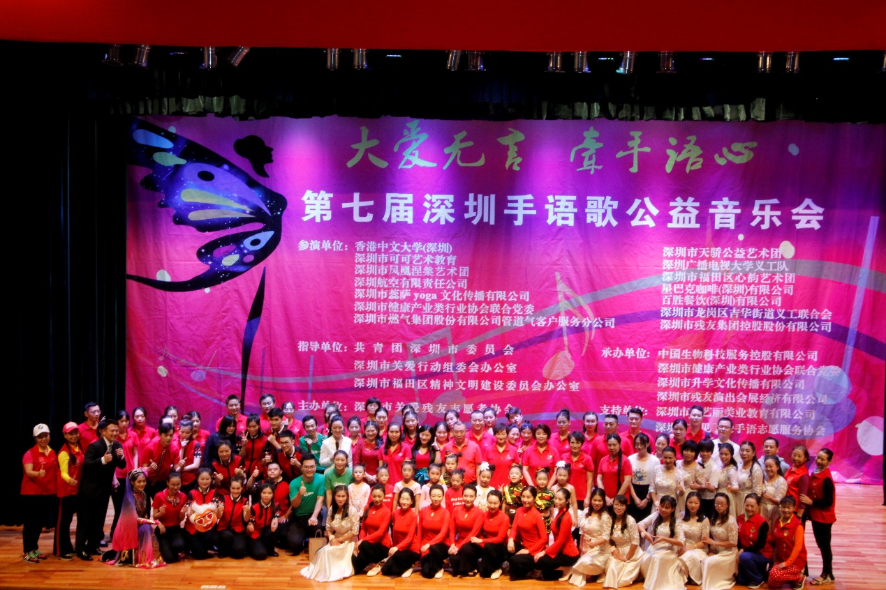 據(jù)悉,本屆手語歌公益音樂會(huì)由深圳市福田區(qū)宣傳文化體育事業(yè)發(fā)展專項(xiàng)資金資助,同時(shí)獲得市委宣傳部、市共青團(tuán)、市關(guān)愛辦、區(qū)精神文明辦的大力支持,由深圳市關(guān)愛殘友志愿者協(xié)會(huì)主辦,中國生物科技服務(wù)控股有限公司、深圳市健康產(chǎn)業(yè)類行業(yè)協(xié)會(huì)聯(lián)合黨委、深圳市升學(xué)文化傳播有限公司和深圳市殘友演出會(huì)展經(jīng)濟(jì)有限公司等單位聯(lián)合協(xié)辦。自2008年首屆手語歌公益音樂會(huì)舉辦以來,歷屆“深圳手語歌公益音樂會(huì)”都會(huì)邀請(qǐng)政府、企事業(yè)單位、社會(huì)團(tuán)體等學(xué)習(xí)手語歌舞、舉行大型公益匯演。(張俊達(dá))