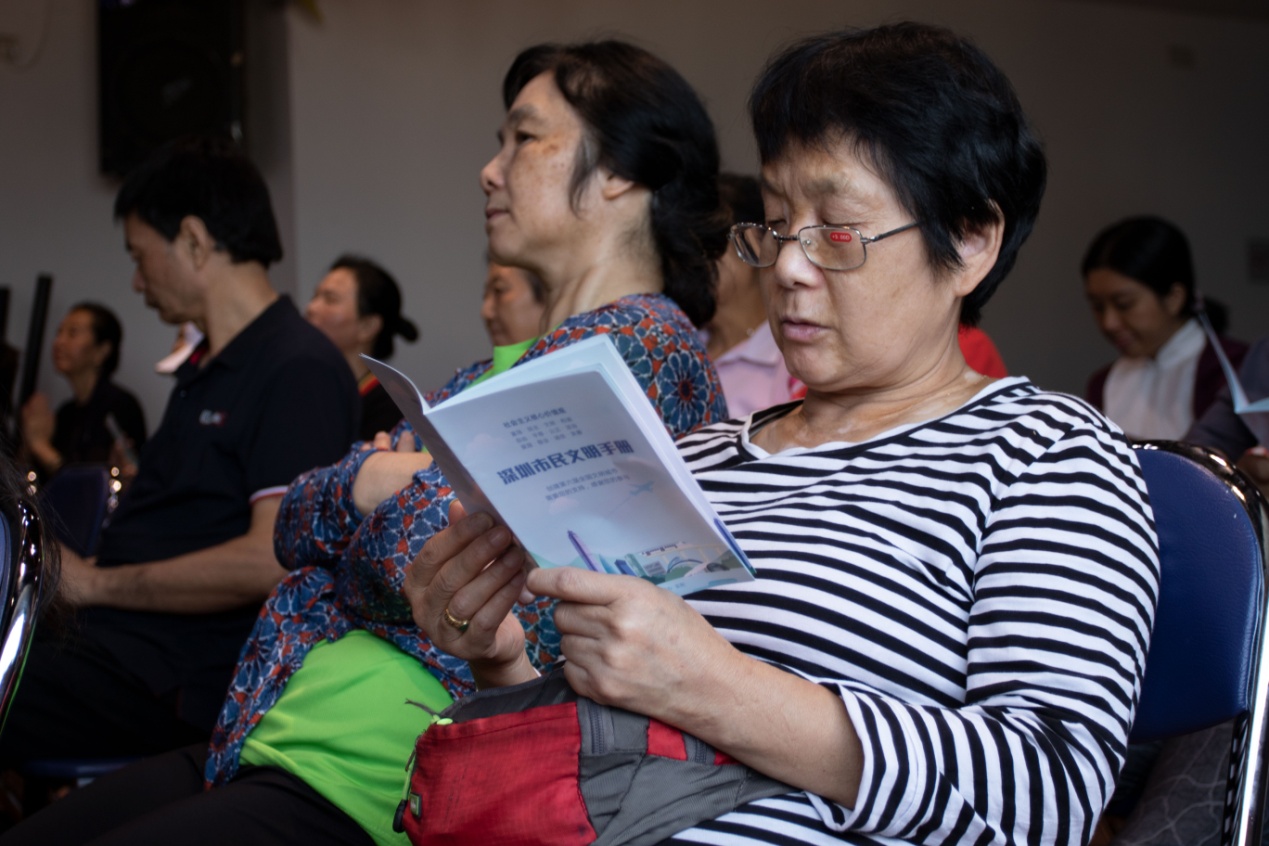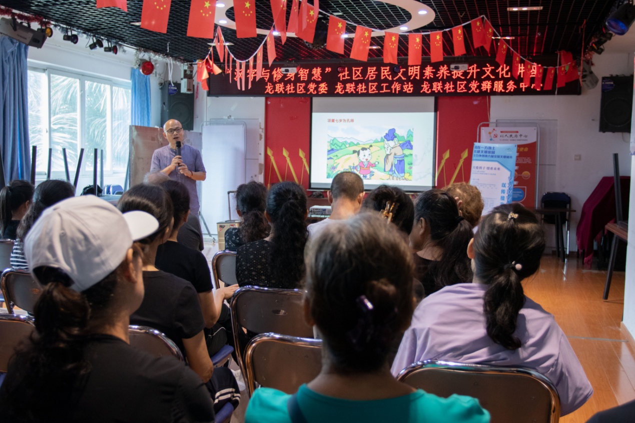 11月13日上午,本系列活動(dòng)的第六場(chǎng)講座在龍聯(lián)社區(qū)工作站拉開了序幕。講座開始前,現(xiàn)場(chǎng)聽眾每人手上都拿到一本《深圳市民公約》小手冊(cè)和《漢字與修身智慧》學(xué)習(xí)資料,劉建彪老師首先跟大家互動(dòng):“我們需要什么樣的家園?文明城市從哪里開始?”“美麗、溫馨、文明、和諧的家園”,臺(tái)下一位叔叔的聲音尤其洪亮,劉老師及時(shí)肯定了他的回答。劉老師接著說(shuō),文明城市從人開始,人是建設(shè)文明城市的中堅(jiān)力量,他進(jìn)一步補(bǔ)充道,做文明人的第一步是轉(zhuǎn)變思想,只有了解并認(rèn)同文明的重要性,才會(huì)自覺地踐行文明禮儀,積極參與城市文明的創(chuàng)建。