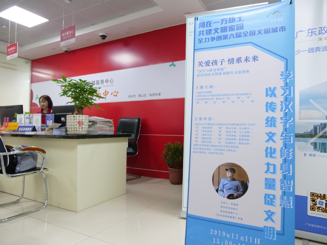 11月11日下午,本系列活動的第三場講座在平山社區(qū)工作站拉開了序幕,此次講座由桃源街道黨工委(辦事處)主辦、深圳市壹書文化傳播有限責任公司承辦、平山社區(qū)黨委協(xié)辦。從2005年起,深圳連續(xù)五次獲得“全國文明城市”的榮譽稱號,在爭創(chuàng)第六屆全國文明城市的關鍵時期,桃源街道辦積極響應市委市政府的號召,堅持求真務實的工作作風,以“‘同在一方熱土共建文明家園’——全力爭創(chuàng)第六屆全國文明城市”為文明創(chuàng)建標語,開展題為“學習漢字與修身智慧,以傳統(tǒng)文化力量促文明”的文化講座,為創(chuàng)建文明城市貢獻一份力量。