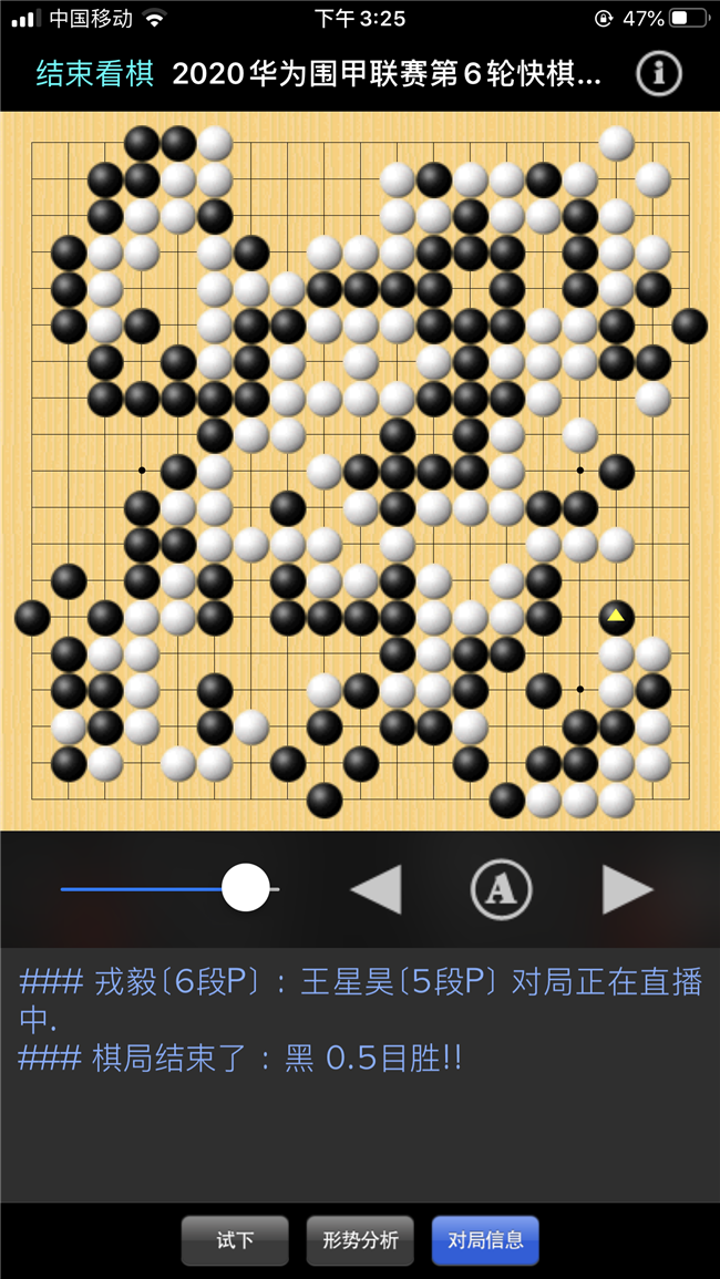 第一臺,戎毅快棋執(zhí)黑對陣小將王星昊。黑棋中盤吃住左下后局面大勝,