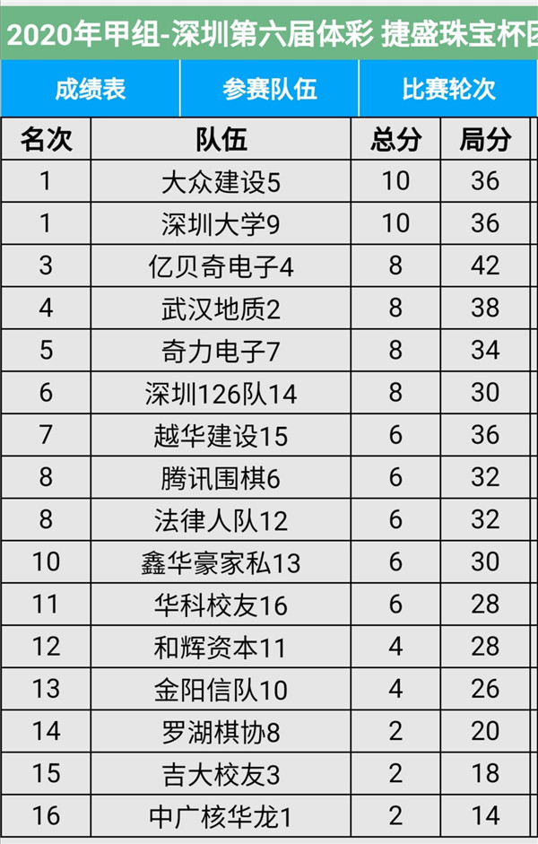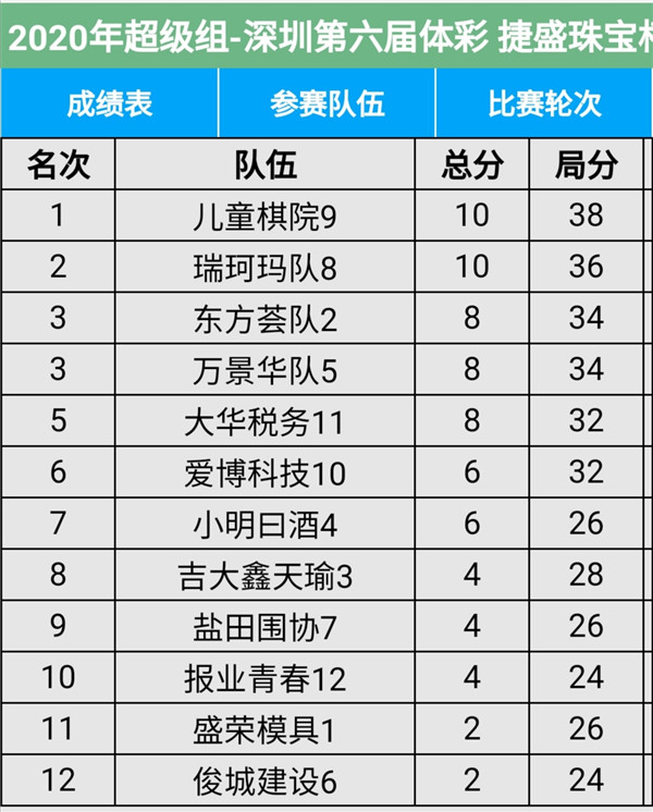 見圳客戶端?深圳新聞網2020年11月8日訊(記者周錦春)第六屆“體彩?捷盛珠寶杯”深圳市圍棋聯賽繼續(xù)在羅湖區(qū)藝嘉大酒店展開,今天是第二場,有第4輪至第6輪的比賽。目前,超級組中,兒童棋院隊、瑞珂瑪隊領先;甲級組中,大眾建設、深圳大學領先。具體賽程結果請看本文附后表格。