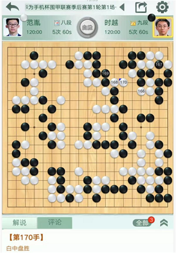 第二臺(tái)慢棋,由深圳隊(duì)的時(shí)越九段執(zhí)黑對(duì)陣民生隊(duì)的范胤八段。開局黑棋左下和左上定型都略有失誤,白棋領(lǐng)先。中盤白棋右上碰三三做劫時(shí)黑棋開劫過(guò)急,應(yīng)該下邊分開白棋較好。之后右邊白棋打入時(shí)黑棋應(yīng)對(duì)方向錯(cuò)誤,又有所虧損,進(jìn)入官子時(shí)黑棋已經(jīng)差距過(guò)大,難以挽回。時(shí)越執(zhí)黑中盤負(fù)范胤。