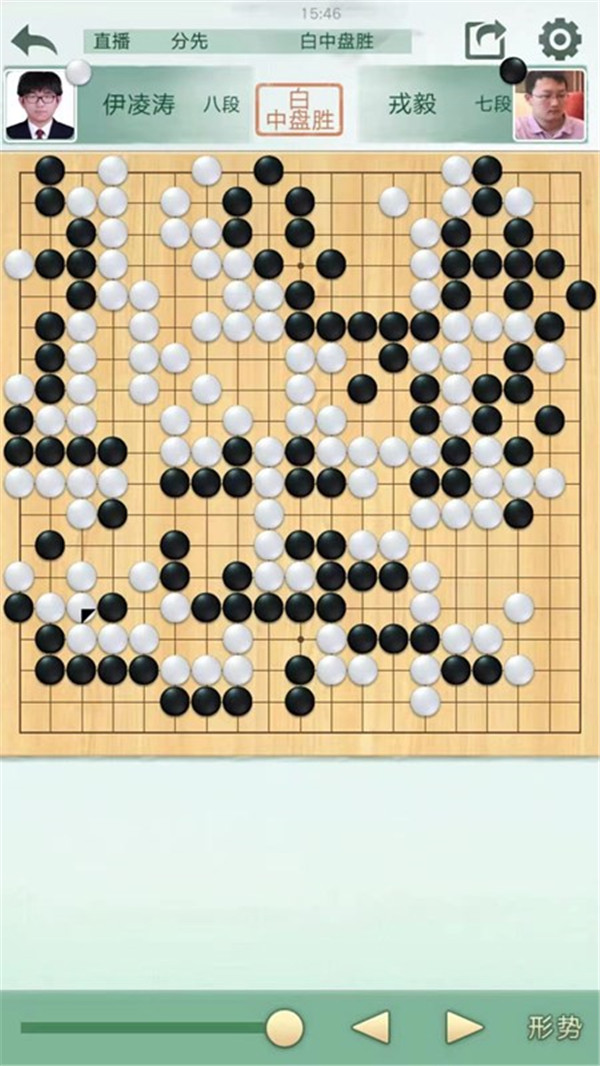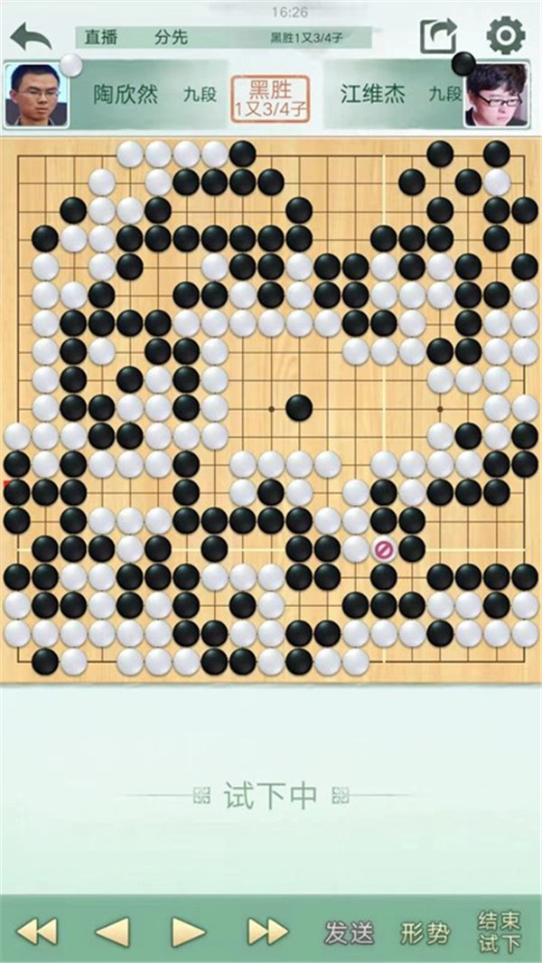 二臺陶欣然執(zhí)白主將對陣世界冠軍江維杰。開局白有利,左邊白棋進攻黑棋時候手法過于松緩,局面接近。之后白棋中央又出現緩手黑棋領先。之后右上白棋主動開劫,但是劫材處理失誤,局面惡化。之后黑棋稍有退讓保持小勝。