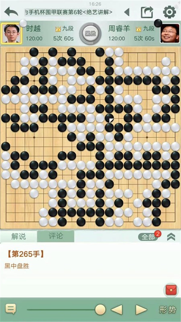 四臺時越執(zhí)白對陣世界冠軍周睿羊。中盤白棋侵消黑棋左上大模樣,黑棋付出很大代價強殺形成打劫。白棋劫爭中不夠細膩沒有擴大戰(zhàn)果而是聯絡成活,局面白稍有利。之后白棋左下連續(xù)下出緩手后局面接近。右下角黑棋二路夾試白應手時白棋嚴重失誤,被黑棋奪走角地后局勢逆轉。