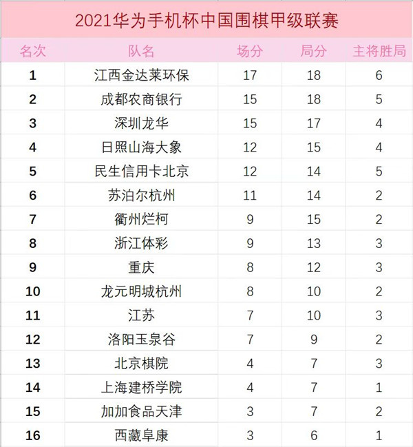 見圳客戶端?深圳新聞網2021年6月7日訊(記者周錦春)華為手機杯男子圍甲聯賽在浙江長興重燃戰(zhàn)火, 深圳龍華隊1:3不敵日照山海大象隊跌落榜首,排名被江西和成都超越降至第三位。上屆冠軍江西金達萊環(huán)保隊本階段首輪繼續(xù)保持勝勢,3比1擊敗北京棋院隊,金身不敗豪取6連勝,并登上積分榜首位。