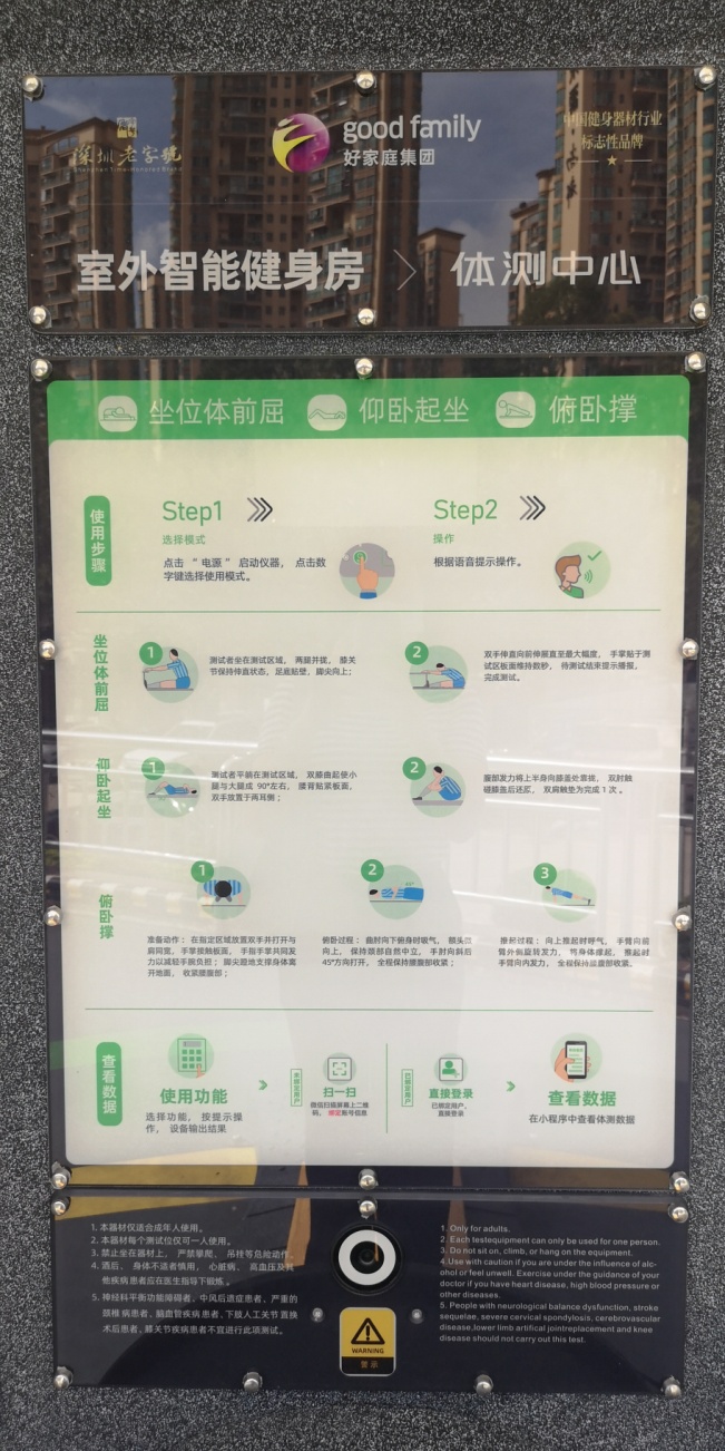 從寶安大道走進(jìn)寶安體育館,沿著裕安一路,在碩大的“室外智能健身設(shè)施”的指引牌下,我們看到了一線極具科技感的健身設(shè)施。這些設(shè)施采用不測(cè)試不訓(xùn)練的理念,通過(guò)科學(xué)健身運(yùn)動(dòng)方式,涵蓋從體質(zhì)測(cè)定到有氧訓(xùn)練、力量訓(xùn)練等訓(xùn)練內(nèi)容,利用智能化系統(tǒng)形成評(píng)估報(bào)告,出具運(yùn)動(dòng)報(bào)告。通過(guò)這套設(shè)備,市民不但可測(cè)試訓(xùn)練,遠(yuǎn)程進(jìn)行線上比賽。同時(shí),配套的系列服務(wù),還可提升市民對(duì)身體、健康運(yùn)動(dòng)、健康飲食的認(rèn)識(shí)。