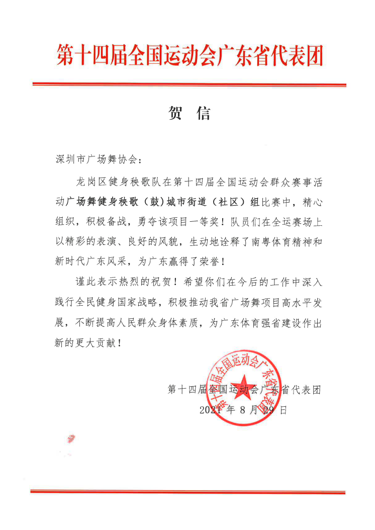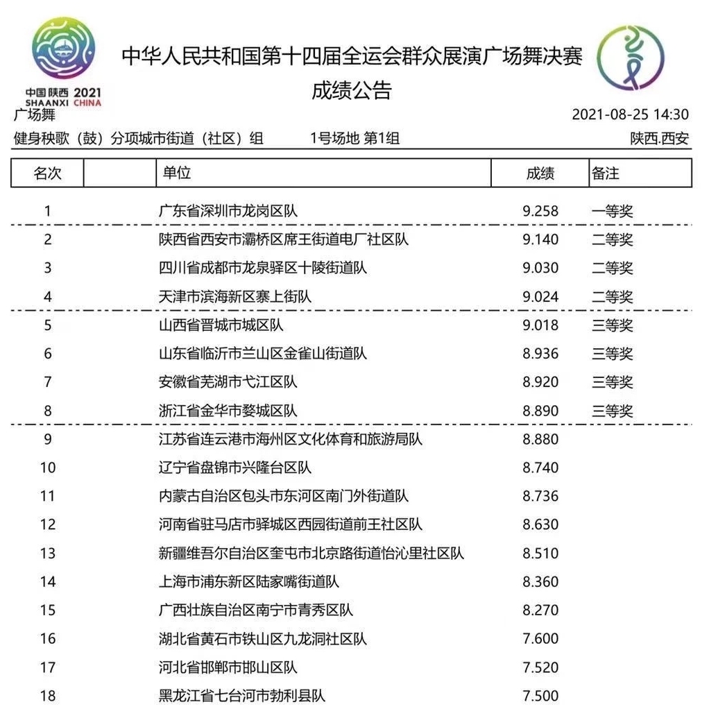 8月29日,第十四屆全國運(yùn)動(dòng)會(huì)群眾展演廣場舞健身秧歌(鼓)項(xiàng)目公布競賽結(jié)果,由深圳市文化廣電旅游體育局和深圳市廣場舞協(xié)會(huì)組織代表廣東省參賽的隊(duì)伍,以一套整齊劃一、剛?cè)岵?jì)的自選套路《我的祖國》戰(zhàn)勝了多個(gè)省市的傳統(tǒng)秧歌強(qiáng)隊(duì),得到最高名次,獲得了含金量十足的城市街道(社區(qū))組一等獎(jiǎng)。