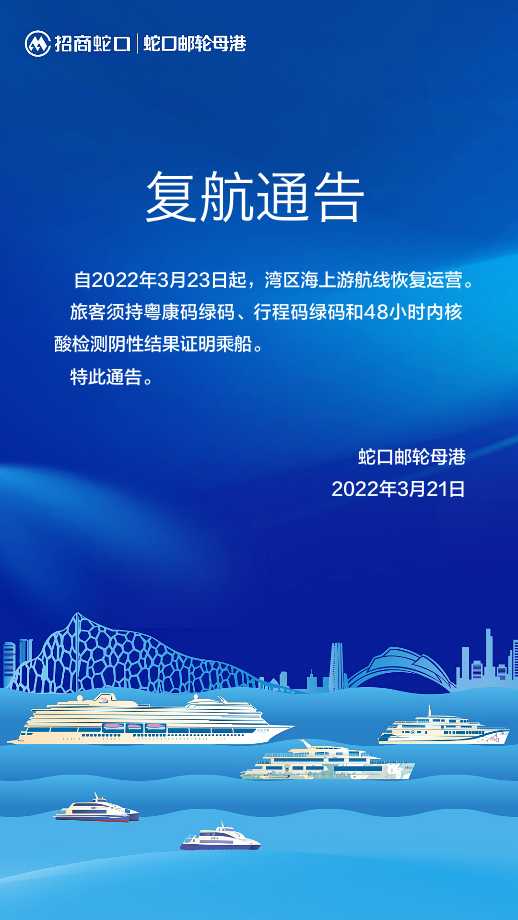 讀特客戶端 ·深圳新聞網(wǎng)2022年3月21日訊(記者 田志強(qiáng))記者從招商蛇口郵輪母港獲悉,自3月23日起,灣區(qū)海上游航線恢復(fù)運(yùn)營。搭乘該航線的旅客須持粵康碼綠碼、行程碼綠碼和48小時(shí)內(nèi)核酸檢測(cè)陰性結(jié)果證明乘船。