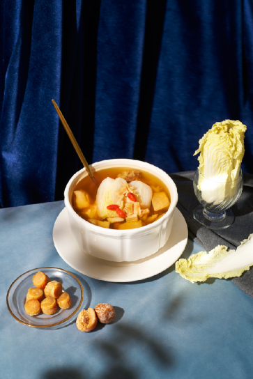 瑤柱菜膽燉土豬展湯,80頭干瑤柱經(jīng)過發(fā)泡,和優(yōu)選食材的土豬肉,娃娃菜一塊入燙盅燉6小時(shí)。水甘味甜,有滋補(bǔ)清潤作用。