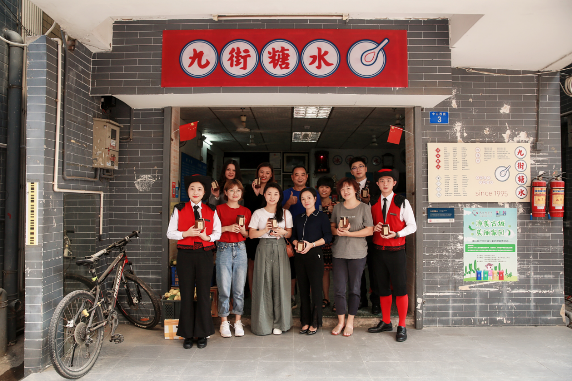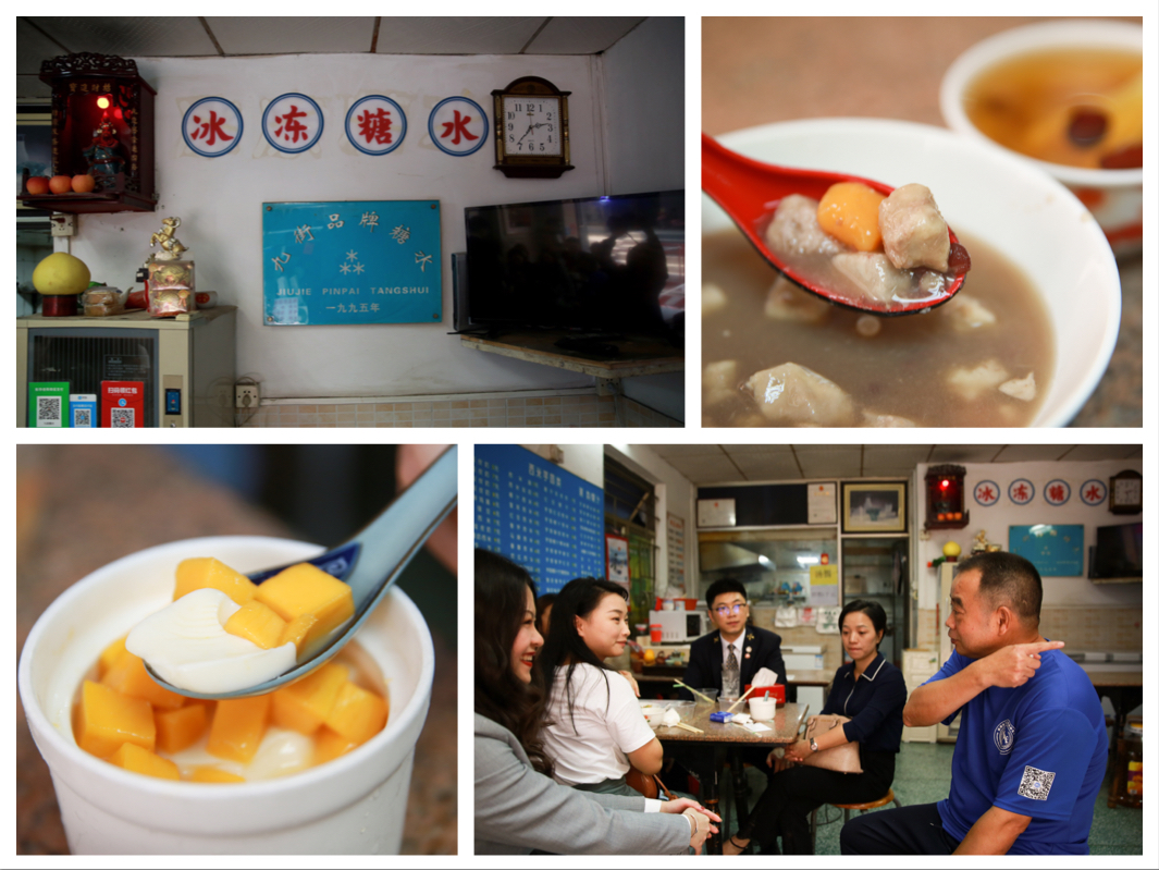 在禮賓司的引領下,大家來到已有千年歷史的文化遺產——南頭古城。一行人在“九街糖水鋪”入座,店主夫妻倆熱情的端出清甜可口的化州糖水和香氣四溢的潮州炒米粉,和我們嘮起了家長里短。大家方才得知,這宛如尋常百姓家的糖水鋪竟開業(yè)于1995年,見證了古城九街的變遷翻新和故去新來的幾代人潮川流。帶著傳播化州糖水美名初衷的糖水世家選擇在深圳發(fā)家,傳到這已是第三代。眾人大快朵頤,禮賓司也幫忙跑堂添茶。