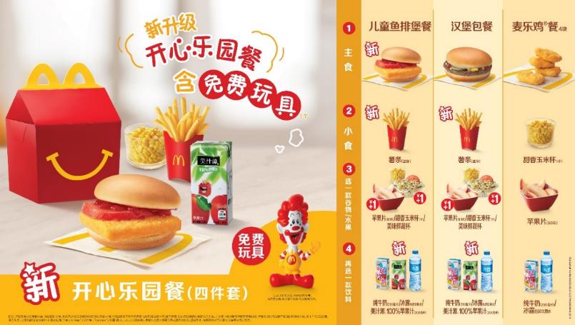 在確保產(chǎn)品美味與質(zhì)量的前提下,麥當(dāng)勞一直致力于實(shí)現(xiàn)更少鹽、更好油、更多蔬果谷物。新開心樂園餐參考了“麥當(dāng)勞全球兒童營養(yǎng)標(biāo)準(zhǔn)”,并充分考慮了中國兒童的膳食營養(yǎng)需求。新套餐從三件套升級為四件套,包括一份主食 (可選肉類蛋白來源:魚、牛、雞)、一份小食 (可選迷你薯?xiàng)l、玉米杯)、一份蔬果 (可選蘋果片、鮮蔬杯、玉米杯)和一份飲品 (可選純牛奶、水、100%蘋果汁 )。