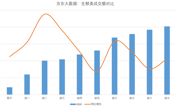 今年春節(jié),線上生鮮品類的需求量大幅增長。京東大數(shù)據(jù)顯示,整個(gè)春節(jié)期間,京東生鮮成交額同比增長215%,為消費(fèi)者提供了近1.5萬噸生鮮產(chǎn)品,蔬菜成交額同比增長近450%。在京東到家平臺(tái)上,除夕至大年初九,糧油副食商品銷售額同比去年春節(jié)增長736.40%,肉品同比增長711.11%,休閑食品增長527.16%,蔬菜增長441.1%,水果增長378.8%,米面糧油、肉禽蛋奶、蔬菜水果和水餃餛飩等速凍食品均十分暢銷。