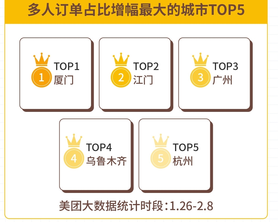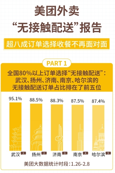 報告顯示,在1月26日至2月8日期間,在使用“無接觸配送”服務占比最高的城市中,武漢、揚州、濟南、南京、哈爾濱排在了前五位。從用餐人數(shù)來看,2人份及以上餐食占總體訂單的比例相比較平時增長了31.7%。采用“無接觸配送”的訂單占到了整體單量的80%以上,且每一單外賣都使用“無接觸配送”服務的用戶占到66%。