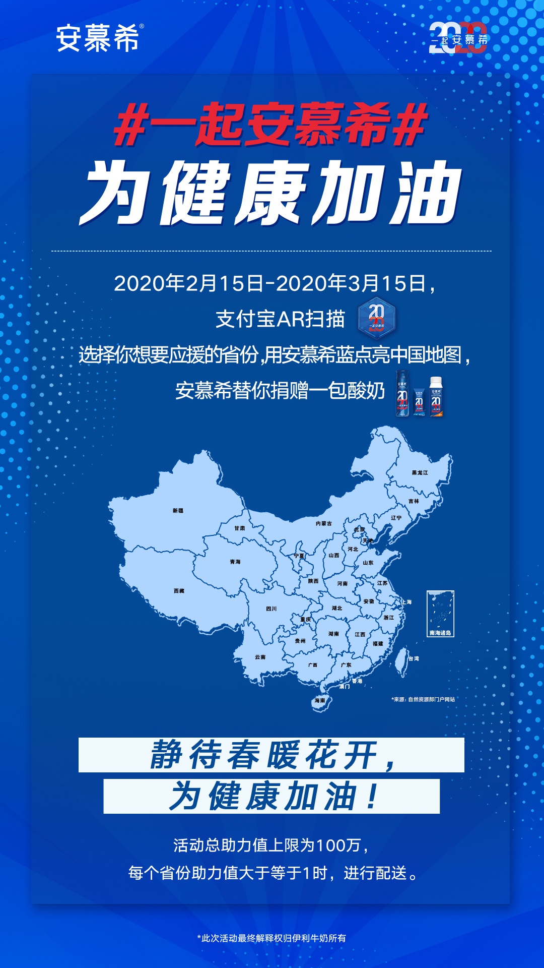 從2月15日起,安慕希發(fā)起“一起為健康加油”公益活動。消費者每成功通過支付寶AR掃描安慕希2020標(biāo)志,并為支持的地區(qū)點藍,安慕希就會為抗疫一線人員送出安慕希產(chǎn)品,將愛心化為實際行動,為戰(zhàn)疫一線加油。