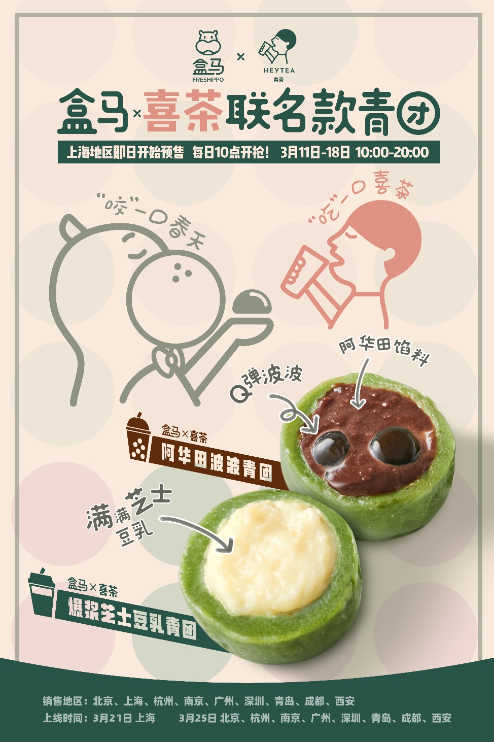 據(jù)了解,盒馬×喜茶聯(lián)名青團(tuán)于3月11日開啟上海地區(qū)的預(yù)售,3月21日將正式上線。北京、杭州、南京、廣州、深圳、青島、成都、西安等地將于3月25日上線,屆時消費(fèi)者可通過盒馬線上下單,30分鐘就能吃上春天的味道。