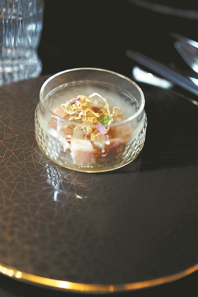 煙焯,當(dāng)廚者將眼前的玻璃罩打開(kāi)時(shí),撲鼻而來(lái)的是蘋(píng)果木的煙熏香氣,閉目吸了一口氣,爾后才動(dòng)勺。先將其中的金槍魚(yú)tata與炸過(guò)的洋蔥和檸檬葉絲等輕輕攪拌,然后開(kāi)吃。據(jù)主理人彪哥介紹,撈起是順德魚(yú)生的吃飯演變而來(lái),金槍魚(yú)tata是日式元素,煙熏是西餐中常用的技法。