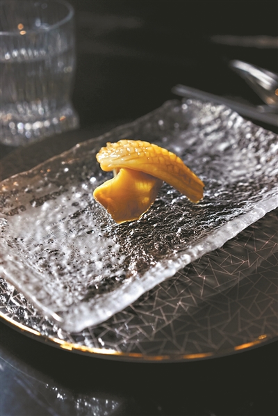湯焯乃雞油焯響螺。1斤1只的響螺去殼與頭后,凈肉僅僅2兩。切成片狀的響螺經(jīng)過(guò)定時(shí)低溫慢煮后,淋上剛剛滾起的熱雞油,上碟時(shí),它旁邊跟著一灘其貌不揚(yáng)的醬汁,那便是紫蘇醬。響螺配紫蘇,勾起人們對(duì)中秋的紫蘇炒田螺的味覺(jué)記憶。油焯的風(fēng)味靈感源自蒜香骨這道傳統(tǒng)粵菜,取蒜香味結(jié)合魚(yú)露醬,融入花膠天婦羅之中。將花膠以天婦羅的方式展現(xiàn),這也是大膽的嘗試。味焯的做法則讓人更熟悉,立馬想起前些年風(fēng)靡廣州的鹵水火鍋來(lái)。獅頭鵝的鵝肝在鹵水里泡著溫泉,時(shí)間一到才起身,并不太咸,香濃恰好。還有汽焯,是用最當(dāng)造的大黃花魚(yú),將整個(gè)迷你小蒸籠搬到面前來(lái),現(xiàn)蒸現(xiàn)吃,7分鐘,嫩度正好?;痨虅t是燒烤澳大利亞和牛肉的燒烤方式,這最原始的烹飪方式里夾著迷迭香和百里香的誘人香氣。而這每一道菜肴,僅僅數(shù)口的分量,道道位上,分量恰到好處,避免了餐桌上的浪費(fèi)。