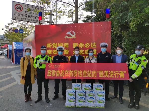 在深圳,2020年2月伊利攜手深圳市關(guān)愛辦及深圳新聞網(wǎng)發(fā)起“致敬‘最美逆行者’”活動,向深圳戰(zhàn)疫一線的民警、交警、醫(yī)務(wù)工作者、義工等進(jìn)行慰問和捐贈,先后前往光明區(qū)光明交警大隊(duì)、光明羌下公安檢查站、寶安區(qū)松安防疫檢查點(diǎn),為戰(zhàn)疫在一線的工作人員送上愛心牛奶與溫暖午餐。