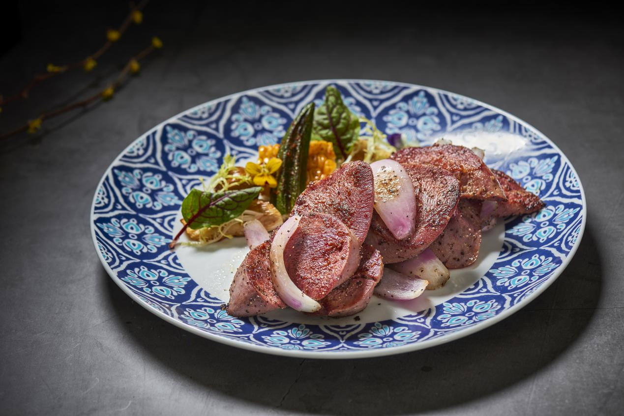 高溫巖燒過(guò)的牛舌,撒以黑椒調(diào)味,口感細(xì)嫩,厚切帶來(lái)的幸福感,激活疲乏味蕾,純粹原始的咸香即瞬蘊(yùn)繞口腔。
