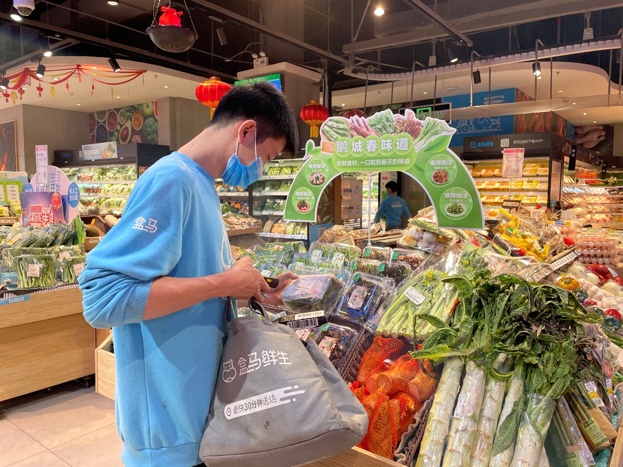 消費者通過手機(jī)下單購買春菜,盒馬小二正在揀貨