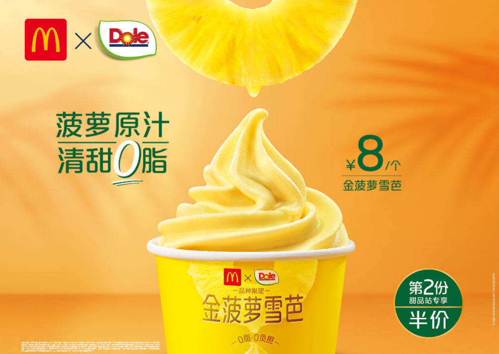 金菠蘿雪芭是麥當(dāng)勞中國的首個(gè)雪芭類產(chǎn)品,使用都樂原榨金菠蘿汁,清甜爽口,濃濃果香無負(fù)擔(dān)。選用的都樂金菠蘿產(chǎn)自菲律賓棉蘭老島,口感細(xì)膩甘甜,果肉金黃多汁。金菠蘿雪芭不含牛奶或奶油成分,脂肪含量為零。該產(chǎn)品已2021年4月21日在麥當(dāng)勞中國28個(gè)城市的2000多個(gè)甜品站售賣,限時(shí)售價(jià)8元,享受第二個(gè)半價(jià)優(yōu)惠。
