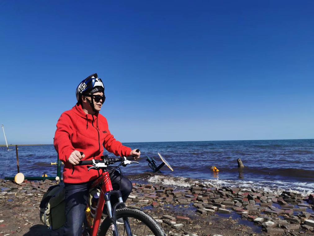 乍到青海湖,湖面浩淼,天空湛藍,水波粼粼,山靜浪涌,花草環(huán)伴,白云微游,鷗俯魚躍,船客爭影,于是,我寫下了“猜1”——是湖非海,似海卻湖;無風浪涌,鷗飛魚躍;地高云淡,氧薄水藍;有邊無際,翠草繞環(huán);山云映護,空天以襯;留影流連,此游何處?
