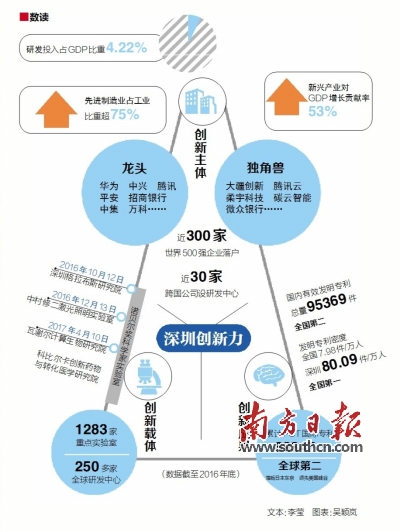 其一,企業(yè)主導(dǎo),政府給力。在整個創(chuàng)新體系中,企業(yè)是技術(shù)創(chuàng)新主體,代表著市場取向;政府是制度創(chuàng)新的主體,主要任務(wù)是營造良好的創(chuàng)新環(huán)境,彌補(bǔ)市場失靈的不足。只有處理好政府和市場的關(guān)系,才能推動整個創(chuàng)新體系不斷完善。因此,深圳一方面讓企業(yè)唱主角,支持企業(yè)創(chuàng)新創(chuàng)業(yè),華為、中興、騰訊、比亞迪等“龍頭”企業(yè)持續(xù)做大做強(qiáng),大疆創(chuàng)新、光啟、柔宇科技等“獨角獸”企業(yè)迅速發(fā)展;另一方面,政府從政策和規(guī)劃層面加強(qiáng)創(chuàng)新體系頂層設(shè)計,圍繞科技管理機(jī)制創(chuàng)新、創(chuàng)業(yè)創(chuàng)新能力提升、強(qiáng)化對外合作等方面構(gòu)建政策支持體系,以企業(yè)為創(chuàng)新驅(qū)動核心、以企業(yè)家群體為創(chuàng)新精神內(nèi)核、政策金融人才協(xié)同共生的創(chuàng)新生態(tài)系統(tǒng)加速形成。