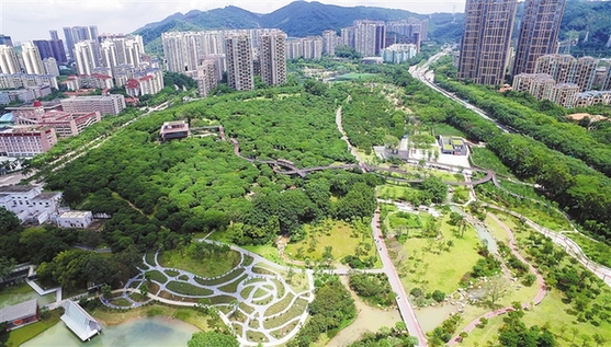 截至2016年底,深圳公園總數(shù)達(dá)921個(gè),功能多樣、覆蓋全面的“公園之城”基本形成。圖為香蜜公園內(nèi)綠色盎然。 深圳商報(bào)記者 鐘華登攝