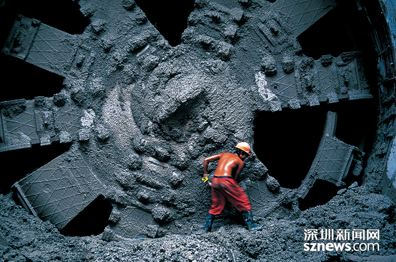 深圳地鐵的建設離不開無數(shù)人的汗水,圖中建設工人正在清理盾構機前的淤泥