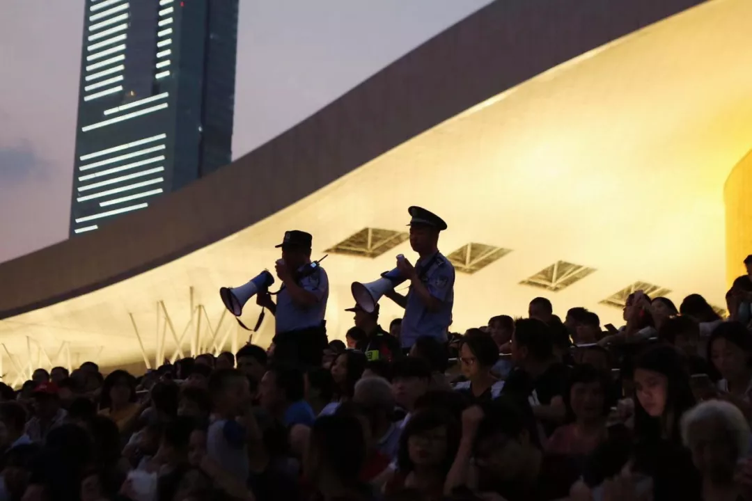 燈光秀表演持續(xù)時(shí)間長(zhǎng),參加安保工作的警力從17點(diǎn)到23點(diǎn)的6個(gè)小時(shí)里,始終處于工作狀態(tài),由于人流量每天都近20萬(wàn)人次,工作強(qiáng)度之大難以想象,但他們毫無(wú)怨言堅(jiān)守崗位,一刻不停地穿梭于人群中,民警和隊(duì)員用人墻隔離出一條條通道,身挎大喇叭,全力疏散引導(dǎo),維護(hù)現(xiàn)場(chǎng)秩序。在各個(gè)出入口、疏散通道、地鐵口、公交站臺(tái)等人流密集點(diǎn)都能看到他們忙碌的身影。