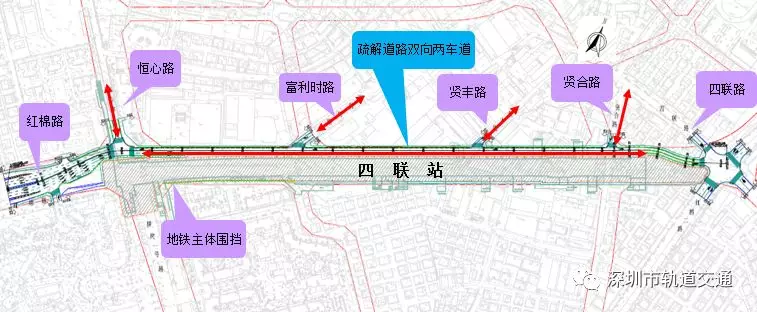 四聯(lián)站位于紅棉路與橫崗一號(hào)路、恒心路交叉口,沿紅棉路東西方向布置,為地下雙層島式車站(局部三層)。紅棉路為東西向主干道,規(guī)劃路寬50m,現(xiàn)狀路寬35m,雙向6車道,車流量較大。車站北側(cè)為新城匯商場(chǎng),西北側(cè)為康樂(lè)幼兒園,西南側(cè)為信義錦繡花園,南側(cè)為康樂(lè)五區(qū)住宅小區(qū),人員相對(duì)密集。