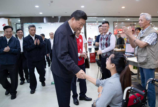 24日上午,社區(qū)居民張瑩瑩正在社區(qū)圖書館查閱資料,習(xí)近平總書記向她走來(lái),與她親切交流。張瑩瑩5歲的時(shí)候因?yàn)樾郝楸园Y落下了腿疾,行動(dòng)不便。她告訴總書記,社區(qū)有300多名殘疾人士,這里有專門為殘疾居民設(shè)計(jì)的戶型。