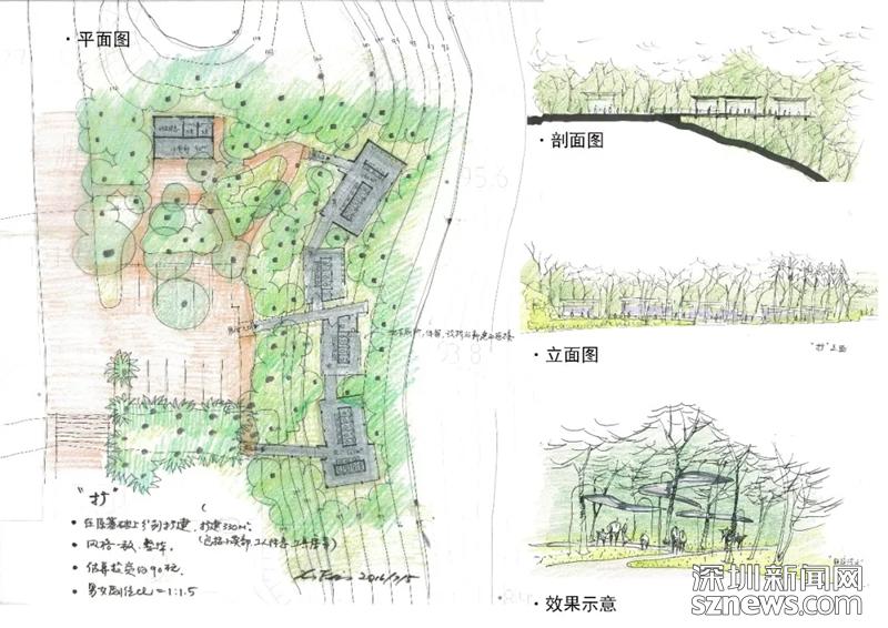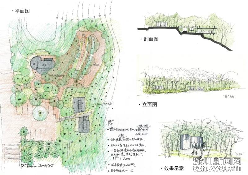 費曉華在文中提到,“隨著深圳人口和游客的劇增,蓮花山頂公共廁所已不堪負重,急需擴大規(guī)模。2016年,本人受蓮花山公園管理處的邀請,免費為他們提供了改擴建方案。方案共有兩種思路:‘隱擴’和‘顯擴’,均是在保留原建筑的基礎(chǔ)上,擴大使用面積以滿足更多人的需求。從更好地保護自然環(huán)境的角度出發(fā),本人推薦‘隱擴’方案。” (附設(shè)計圖)