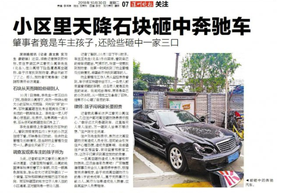 沒(méi)想到,最后得知原來(lái)是自己的小孩貪玩,從一樓施工處拿走了石塊,結(jié)果不小心砸了自家的車。