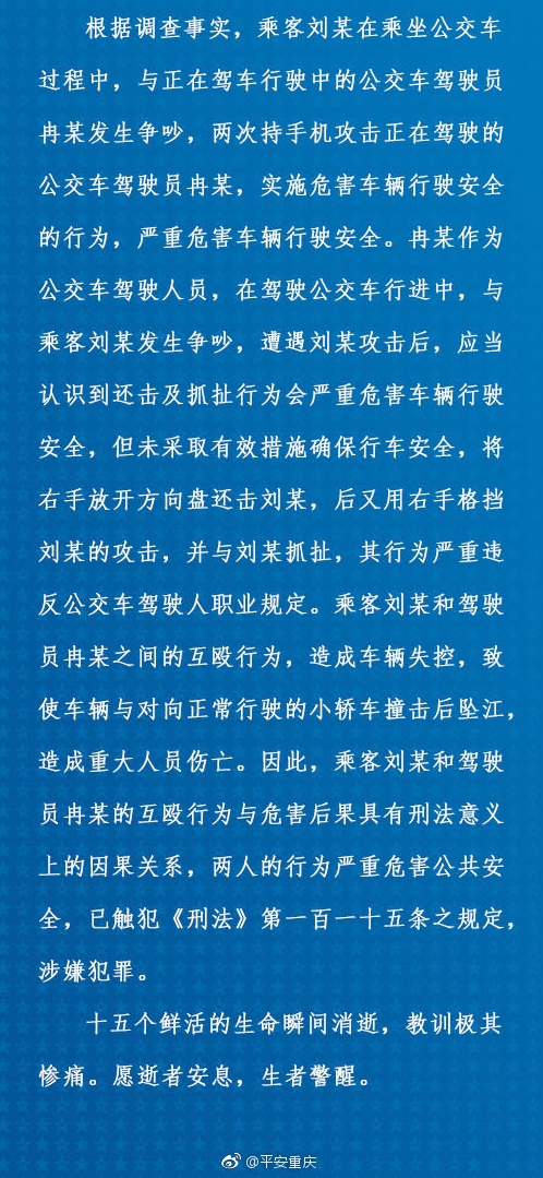 深圳新聞網(wǎng)11月5日訊(記者 張玲)2018年10月28日10時(shí)08分,重慶市萬(wàn)州區(qū)長(zhǎng)江二橋發(fā)生重大交通事故,一輛大巴車在行駛中突然越過(guò)中心實(shí)線撞上一輛正常行駛的紅色小轎車后墜江。重慶公交墜江事故的原因經(jīng)“平安重慶”發(fā)布后,全民熱議。因乘客劉某坐過(guò)站引發(fā)與司機(jī)冉某的口角進(jìn)而爭(zhēng)執(zhí)升級(jí),最終導(dǎo)致悲劇發(fā)生,公交車失控沖入江中,全車乘客殞命。廣東卓建律師事務(wù)所律師高級(jí)合伙人于智亮律師接受記者采訪時(shí)強(qiáng)調(diào),暴力干擾司機(jī)正常駕駛的行為涉嫌以危險(xiǎn)方法危害公共安全罪。