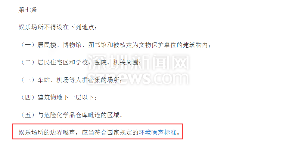 此外,該管理條例還對娛樂場所的邊界噪聲做出了明確規(guī)定,要求其邊界噪聲應(yīng)當(dāng)符合國家規(guī)定的環(huán)境噪聲標(biāo)準,即睡眠30分貝。