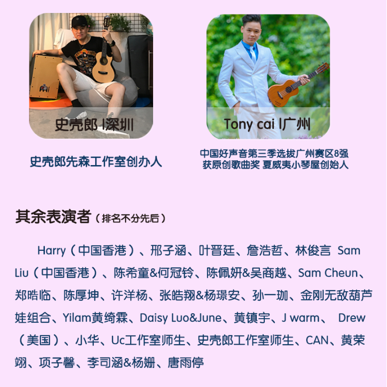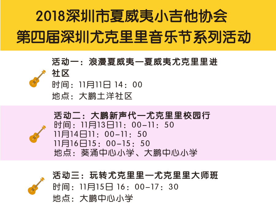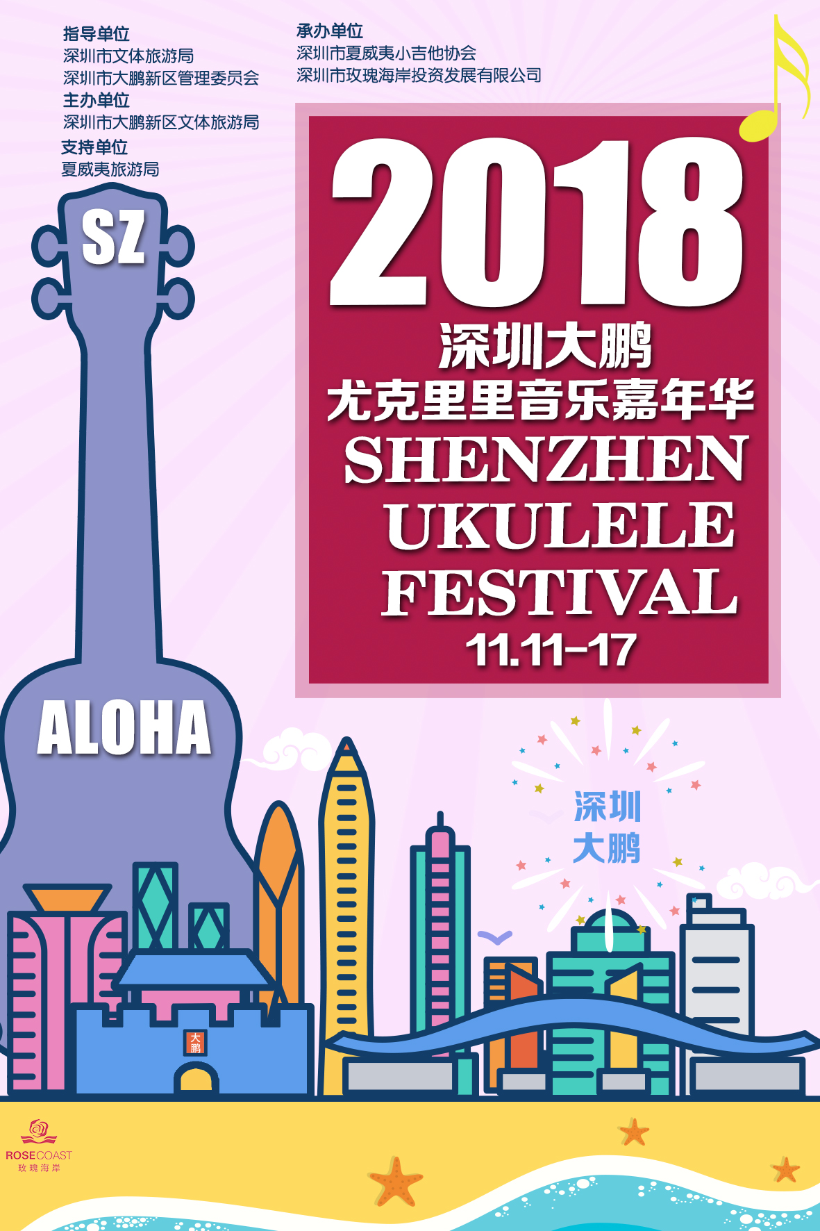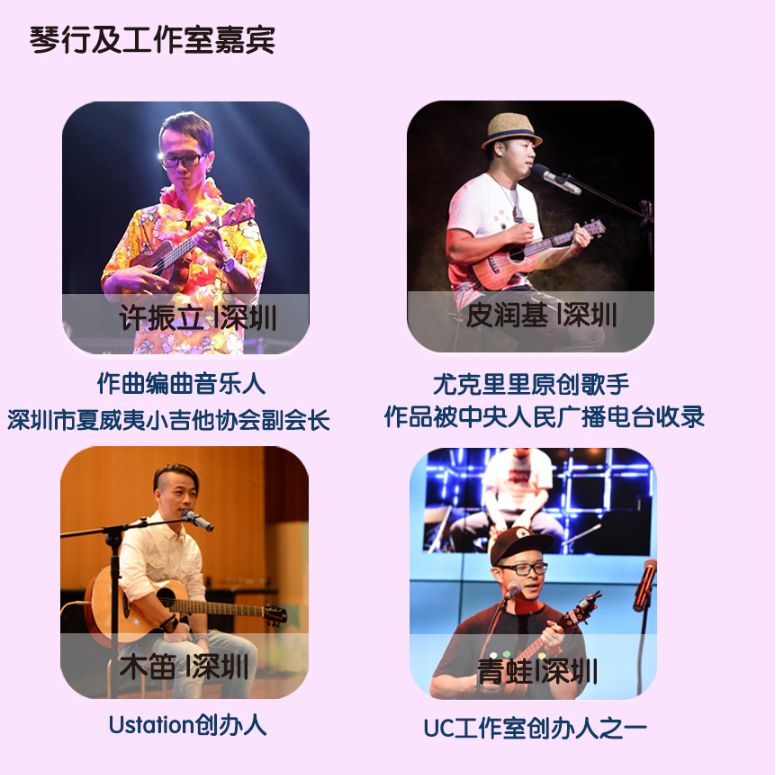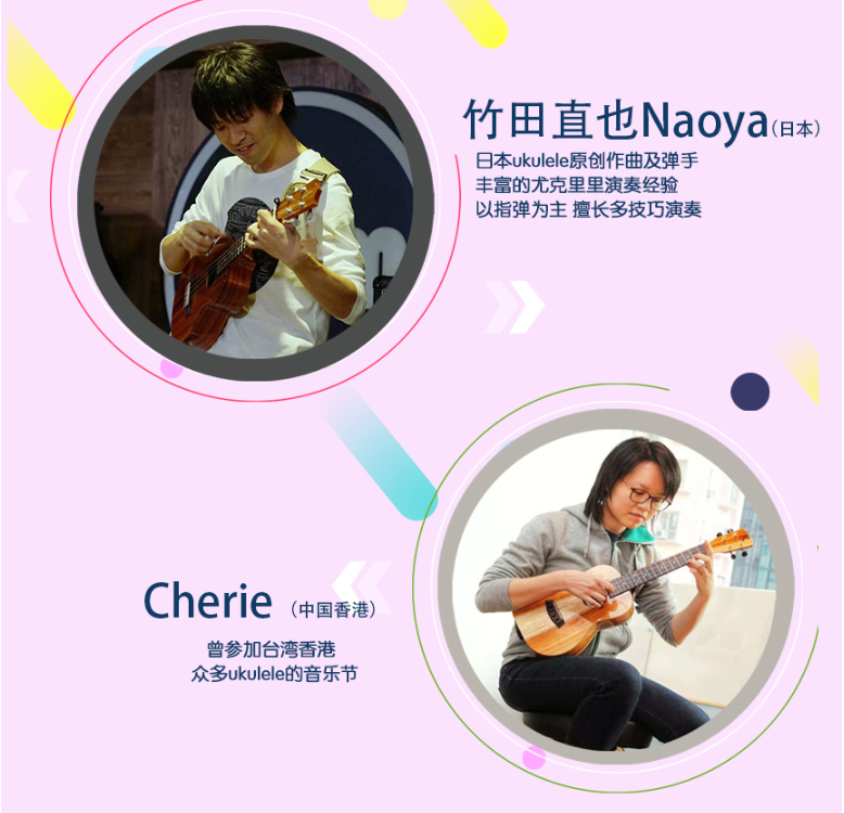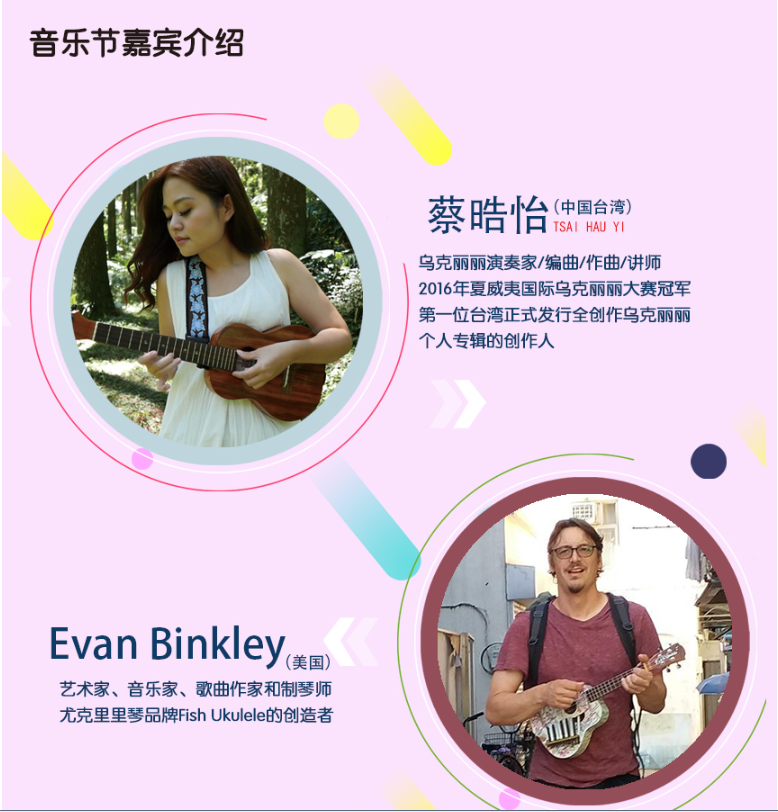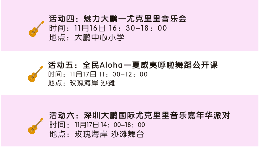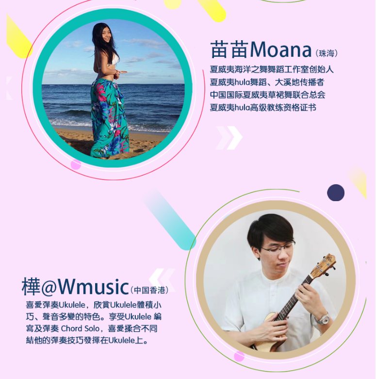 其中全民參與嘉年華音樂會11月17日的將會在深圳市玫瑰海岸沙灘舉辦,有深圳、香港(中國)、臺灣(中國)、美國、日本、廣州、中山、珠海等地的嘉賓和愛好者近50組表演者帶來4小時尤克里里盛會,表演者年齡跨度更是從5歲到60歲。嘉年華現(xiàn)場除了尤克里里音樂會,還將有Moana夏威夷呼拉舞風情體驗,中國臺灣尤克里里協(xié)會會長陳建廷新書《兒童尤克里里英文暢游》深圳首發(fā),中國臺灣尤克里里世界大賽冠軍蔡皓怡原創(chuàng)專輯《航海日志》深圳首發(fā),以及美國尤克里里音樂家、藝術家新專輯《粉色海豚》尤克里里專輯中國大陸首發(fā)。