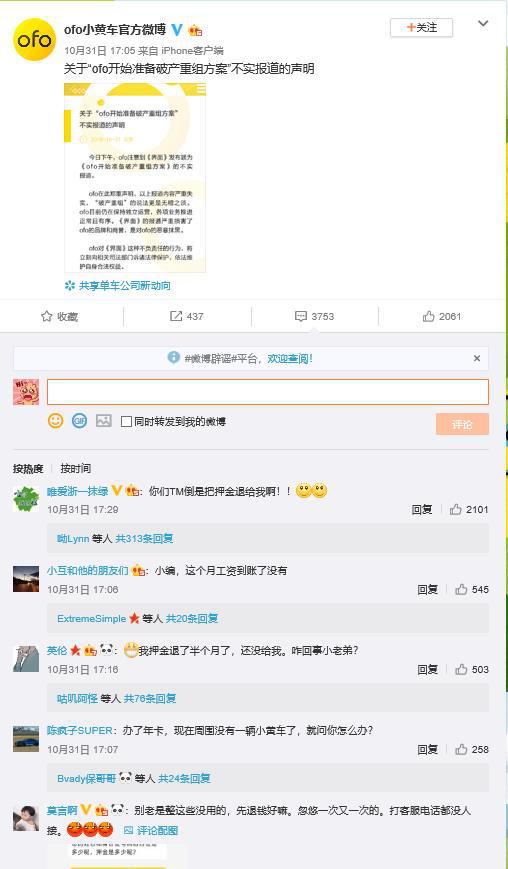 今年10月底,《界面》新聞發(fā)布題為《ofo開始準備破產(chǎn)重組方案》的報道。當日,ofo官微稱該報道嚴重失實,將訴諸法律維護自身合法權益。