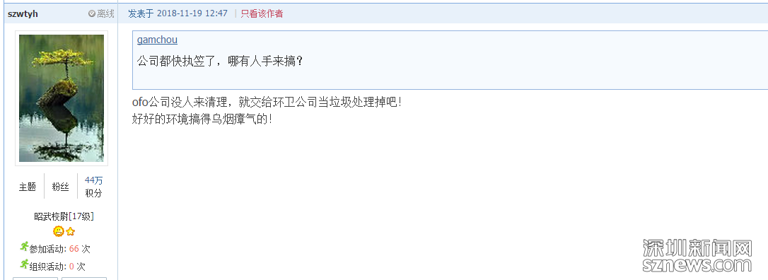 “福田河的水質(zhì)很好,但大量的故障單車停放在路邊實(shí)在是煞風(fēng)景?!本W(wǎng)友“szwtyh”認(rèn)為,不應(yīng)該讓這些單車礙了深圳的城市景觀,掃了市民欣賞福田河水的興致。