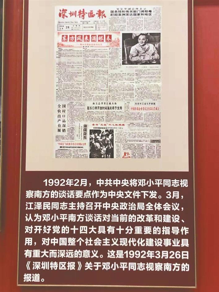 ▲展覽展出的1992年3月26日刊登長篇通訊《東方風(fēng)來滿眼春》的《深圳特區(qū)報》頭版圖片。
