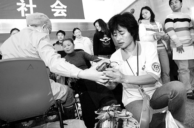 2006年,深圳獻(xiàn)血女狀元高敏在捐血現(xiàn)場協(xié)助醫(yī)生工作。 記者 許業(yè)周 攝